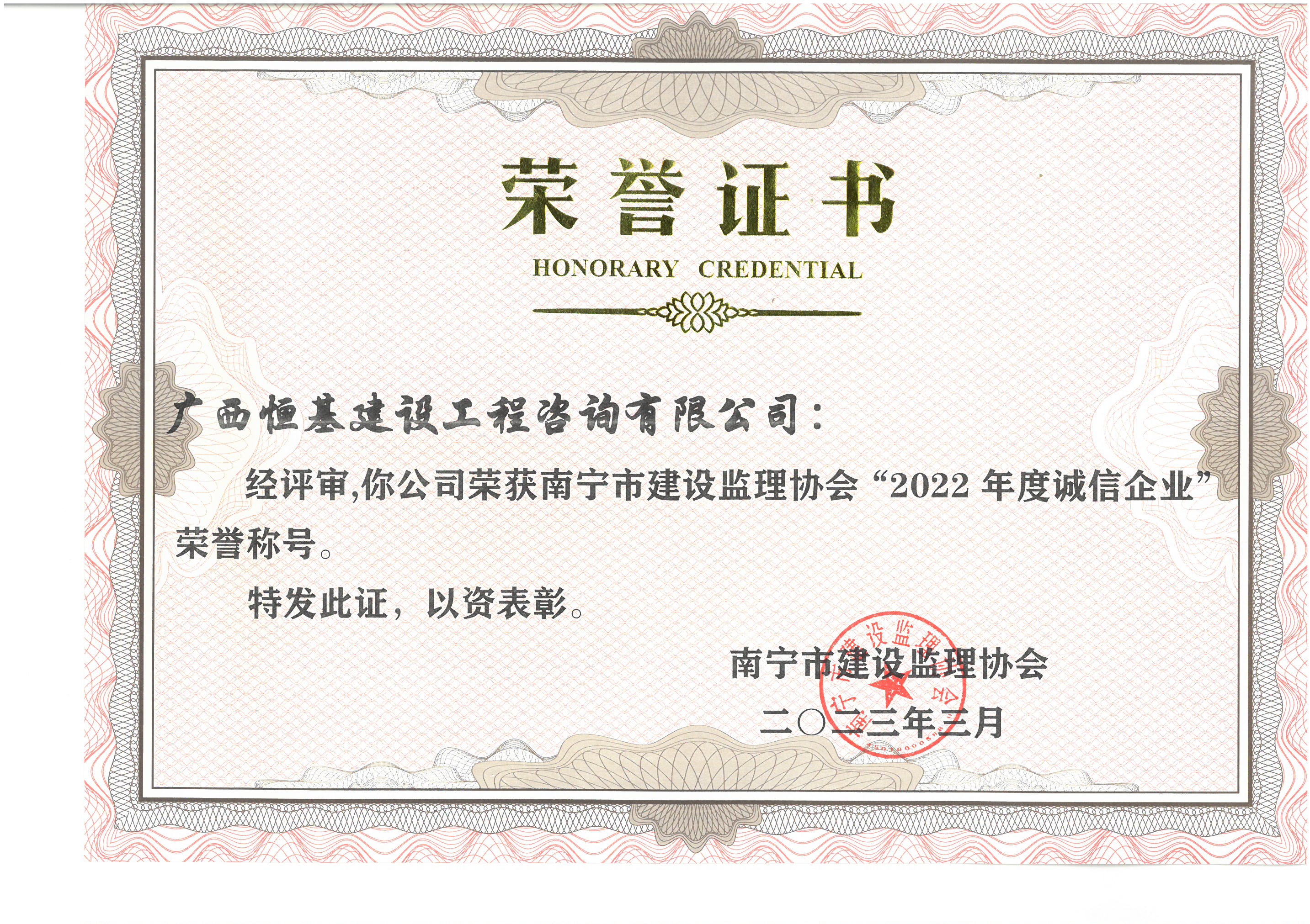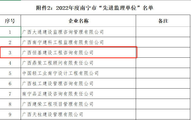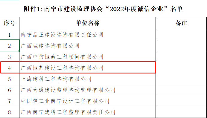 近日,南寧市建設(shè)監(jiān)理協(xié)會(huì)公布了2022年度優(yōu)秀監(jiān)理單位及優(yōu)秀個(gè)人表彰名單,我司連續(xù)多年獲評(píng) “2022年度誠信企業(yè)”及2022年度南寧市“先進(jìn)監(jiān)理單位”榮譽(yù)稱號(hào)。