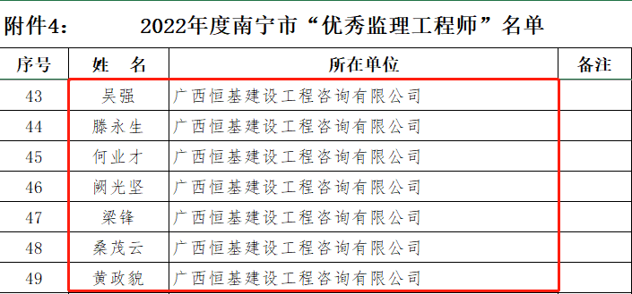 衡量一家企業(yè)綜合實(shí)力的重要指標(biāo),它是基于評(píng)估對(duì)象的信用紀(jì)錄、履約能力、經(jīng)營狀況、綜合實(shí)力與競(jìng)爭(zhēng)力等多項(xiàng)指標(biāo)的科學(xué)評(píng)估與認(rèn)證。獲評(píng)“2022年度誠信企業(yè)”及2022年度南寧市“先進(jìn)監(jiān)理單位”這一殊榮,是誠信經(jīng)營累計(jì)的集中體現(xiàn),標(biāo)志著恒基咨詢?cè)谛袠I(yè)內(nèi)的企業(yè)信用、項(xiàng)目管理能力、社會(huì)責(zé)任等方面均得到監(jiān)理行業(yè)的充分認(rèn)可。2022年度"先進(jìn)監(jiān)理單位"此外,本次公布的年度評(píng)選優(yōu)秀個(gè)人名單中我司共14人獲評(píng)“優(yōu)秀總監(jiān)理工程師”和“優(yōu)秀監(jiān)理工程師”。榮譽(yù)既是對(duì)我司項(xiàng)目管理服務(wù)和監(jiān)理人員工作成績(jī)的肯定,也是對(duì)企業(yè)推動(dòng)行業(yè)示范效應(yīng)和杰出人才培養(yǎng)的激勵(lì)。2022年度"優(yōu)秀總監(jiān)理工程師"2022年度"優(yōu)秀監(jiān)理工程師"本次評(píng)定體現(xiàn)了公司在監(jiān)理行業(yè)中堅(jiān)持誠信守法經(jīng)營、切實(shí)履行社會(huì)責(zé)任的肯定,對(duì)提高公司知名度、拓寬經(jīng)營領(lǐng)域、提升競(jìng)爭(zhēng)優(yōu)勢(shì)等起到積極推動(dòng)作用,也將進(jìn)一步激勵(lì)公司為行業(yè)高質(zhì)量發(fā)展作出新的貢獻(xiàn)。