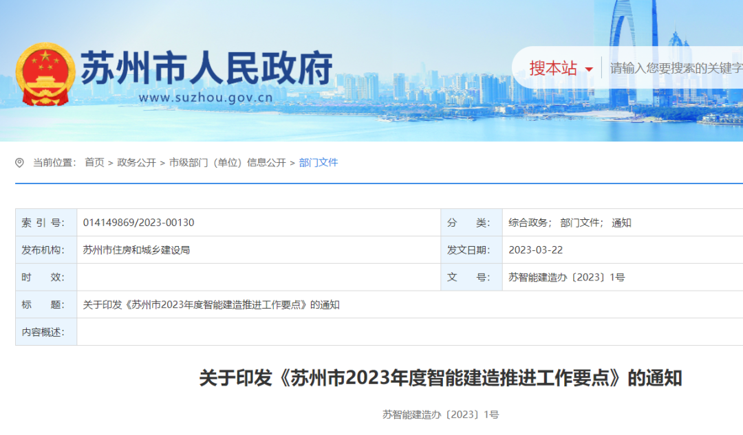 近日,蘇州市住建局印發(fā)《蘇州市2023年度智能建造推進(jìn)工作要點(diǎn)》(蘇智能建造辦〔2023〕1號(hào))。