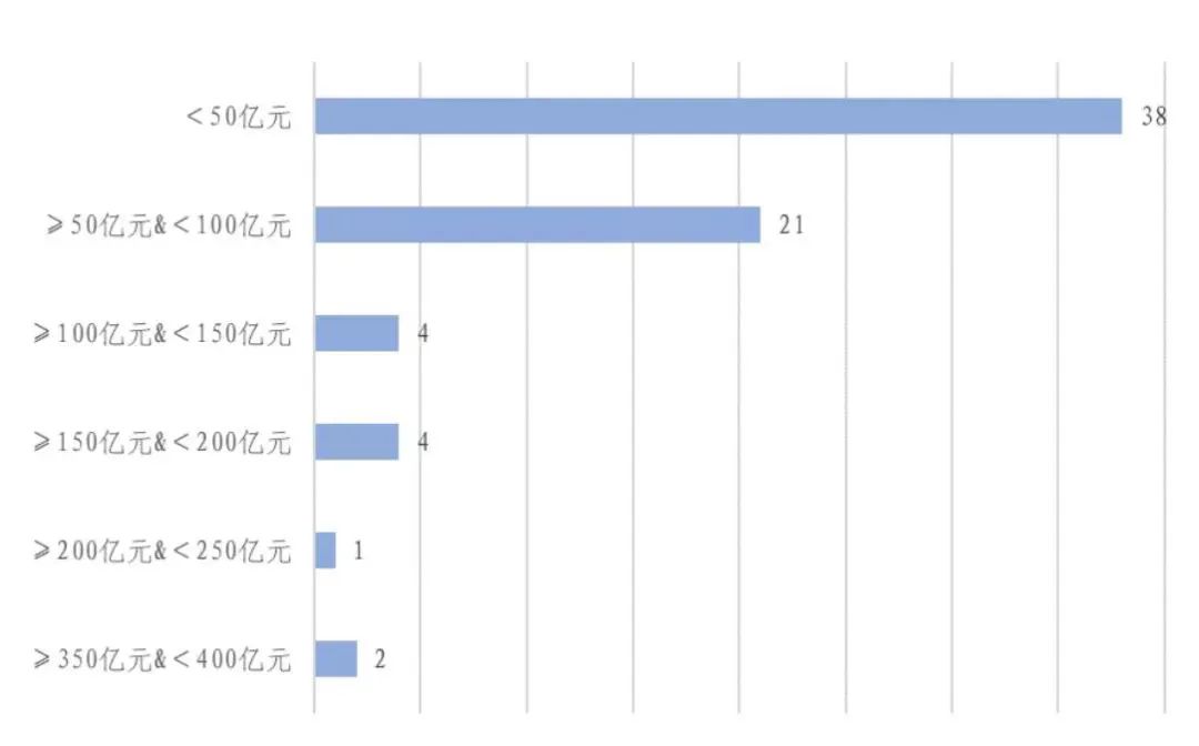 通過(guò)對(duì)兩批94個(gè)EOD試點(diǎn)項(xiàng)目公開(kāi)資料的查閱,目前已知投資額度的項(xiàng)目有70個(gè),總投資額為4420.17億元。投資額在50億元以下和50億元以上,100億元以下的項(xiàng)目數(shù)量分布較多,共計(jì)59個(gè),占已調(diào)查項(xiàng)目的85.13%,其中,“韶關(guān)市曲江區(qū)生態(tài)環(huán)境導(dǎo)向的煤矸石綜合利用項(xiàng)目”投資額最小,為3億元;而投資額在200億元以上的項(xiàng)目?jī)H有3個(gè),分別是:“重慶市經(jīng)濟(jì)開(kāi)發(fā)區(qū)生態(tài)環(huán)境導(dǎo)向的開(kāi)發(fā)項(xiàng)目”(390億元)、“涪江遂寧主城區(qū)段環(huán)境綜合整治與城鄉(xiāng)一體化融合開(kāi)發(fā)項(xiàng)目”(368億元)和“莆田市木蘭溪綬溪片區(qū)生態(tài)環(huán)境導(dǎo)向的開(kāi)發(fā)項(xiàng)目”(210億元)。
