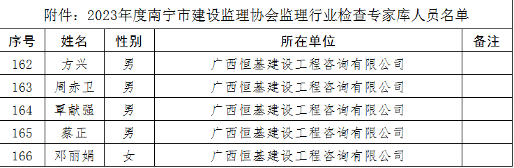 經(jīng)南寧市監(jiān)理協(xié)會(huì)嚴(yán)格審核、崗前培訓(xùn)及考試,根據(jù)《關(guān)于重新推薦協(xié)會(huì)監(jiān)理行業(yè)專家?guī)斓耐ㄖ泛汀蛾P(guān)于舉辦南寧市建設(shè)監(jiān)理協(xié)會(huì)監(jiān)理行業(yè)專家?guī)旌蜻x成員現(xiàn)場(chǎng)監(jiān)理行為考評(píng)崗前培訓(xùn)的通知》文件要求,廣西恒基建設(shè)工程咨詢有限公司5名專家成功入選南寧市建設(shè)監(jiān)理協(xié)會(huì)監(jiān)理行業(yè)檢查專家?guī)臁?/p>