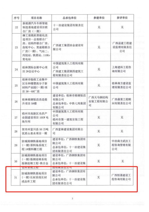 近日,廣西建筑業(yè)聯(lián)合會(huì)公布2023年度廣西鋼結(jié)構(gòu)金獎(jiǎng)工程名單,廣西恒基咨詢監(jiān)理的防城港鋼鐵基地項(xiàng)目(一期)長(zhǎng)材系統(tǒng)長(zhǎng)材成品庫工程位列其中。