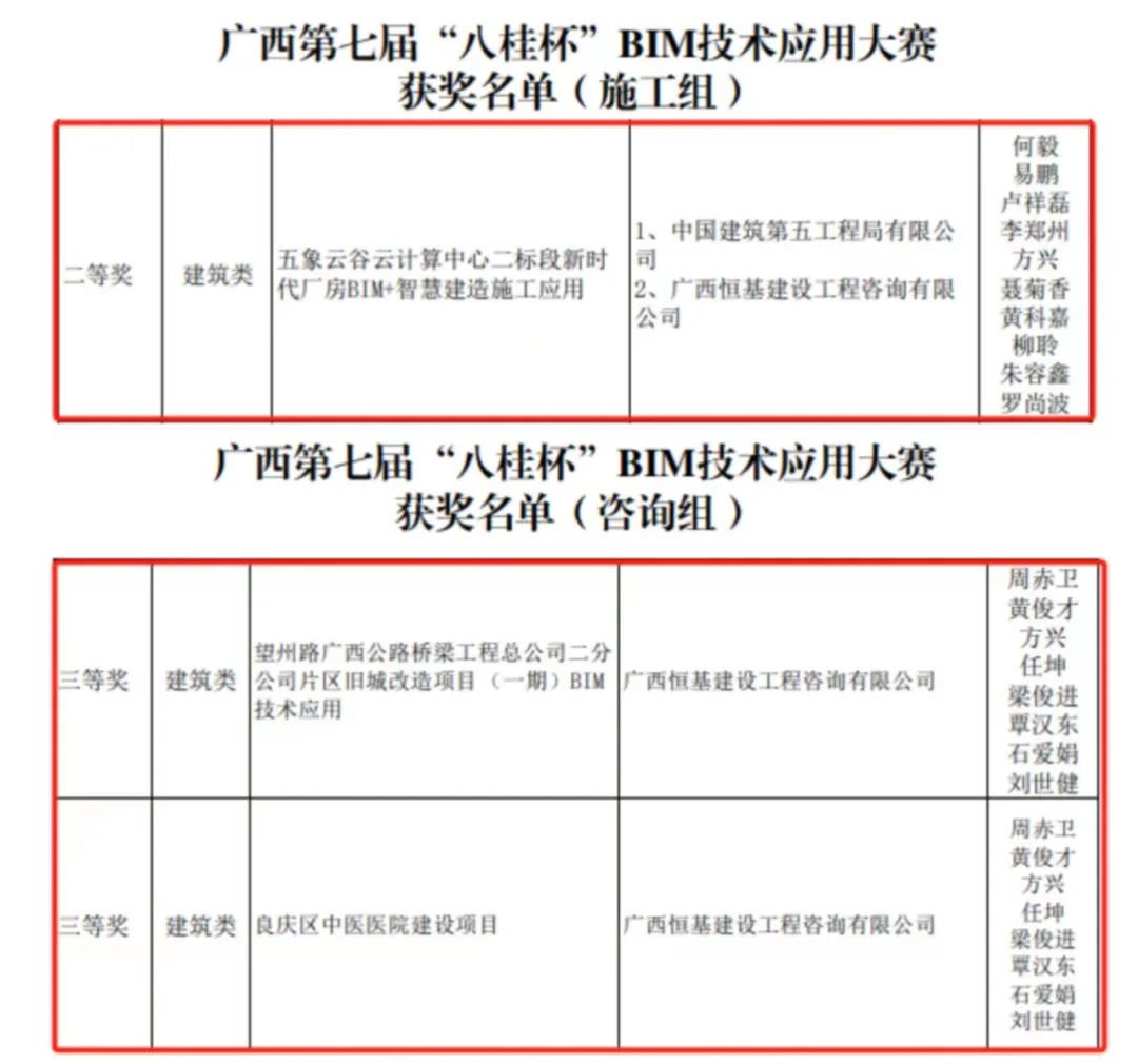 近日,廣西壯族自治區(qū)第七屆“八桂杯” BIM技術應用大賽獲獎名單公布,恒基咨詢參賽項目《五象云谷云計算中心二標段新時代廠房BIM+智慧建造施工應用》榮獲施工組二等獎,《望州路廣西公路橋梁工程總公司二分公司片區(qū)舊城改造項目(一期)BIM技術應用》《良慶區(qū)中醫(yī)醫(yī)院建設項目》榮獲咨詢組三等獎。