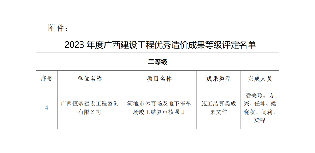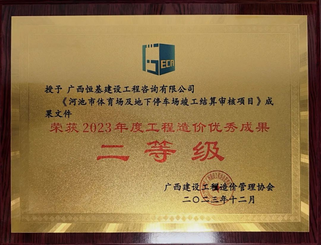 近日,廣西建設(shè)工程造價管理協(xié)會召開第五屆第五次理事會暨第三次會員代表大會,會上頒發(fā)2023年度優(yōu)秀工程造價成果等級評定證書,恒基咨詢《河池市體育場及地下停車場竣工結(jié)算審核項目》成果文件榮獲2023年度工程造價優(yōu)秀成果二等級。