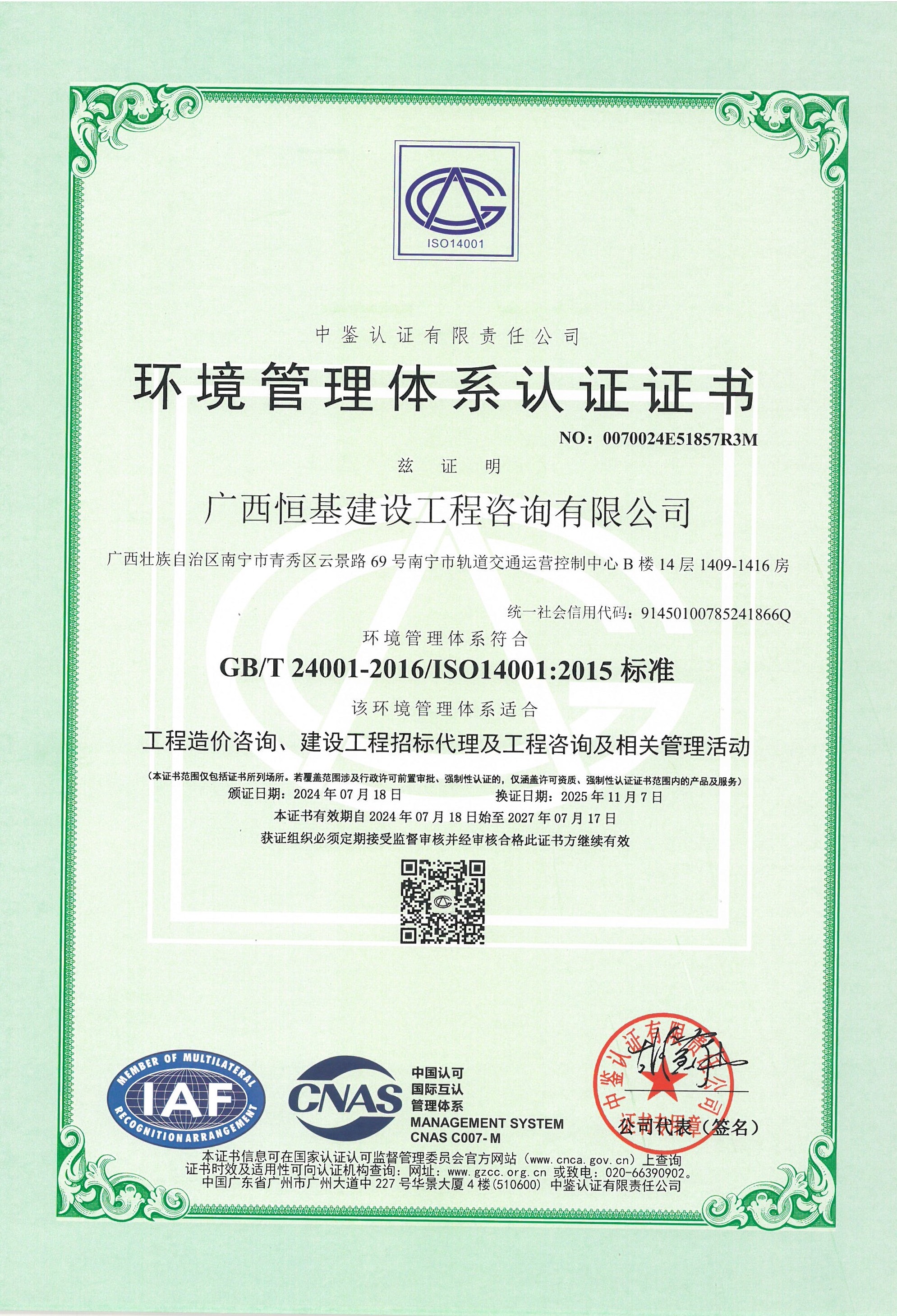環(huán)境管理體系認證證書