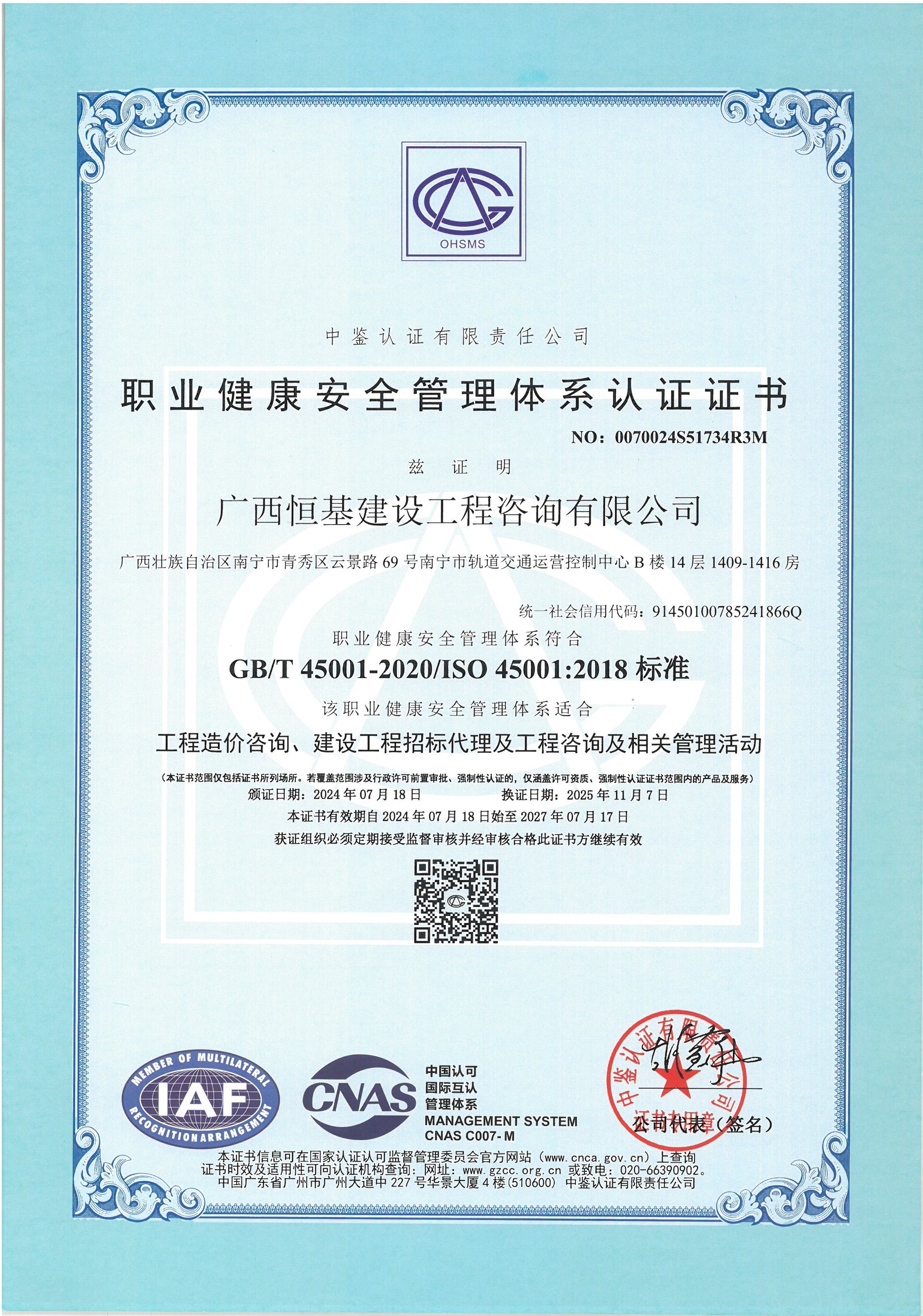 職業(yè)健康安全管理體系認證證書