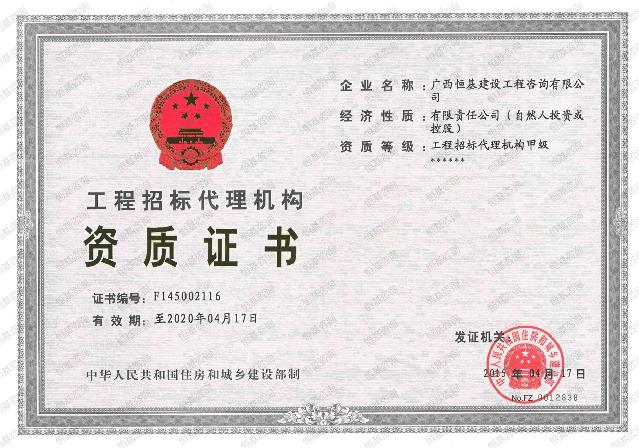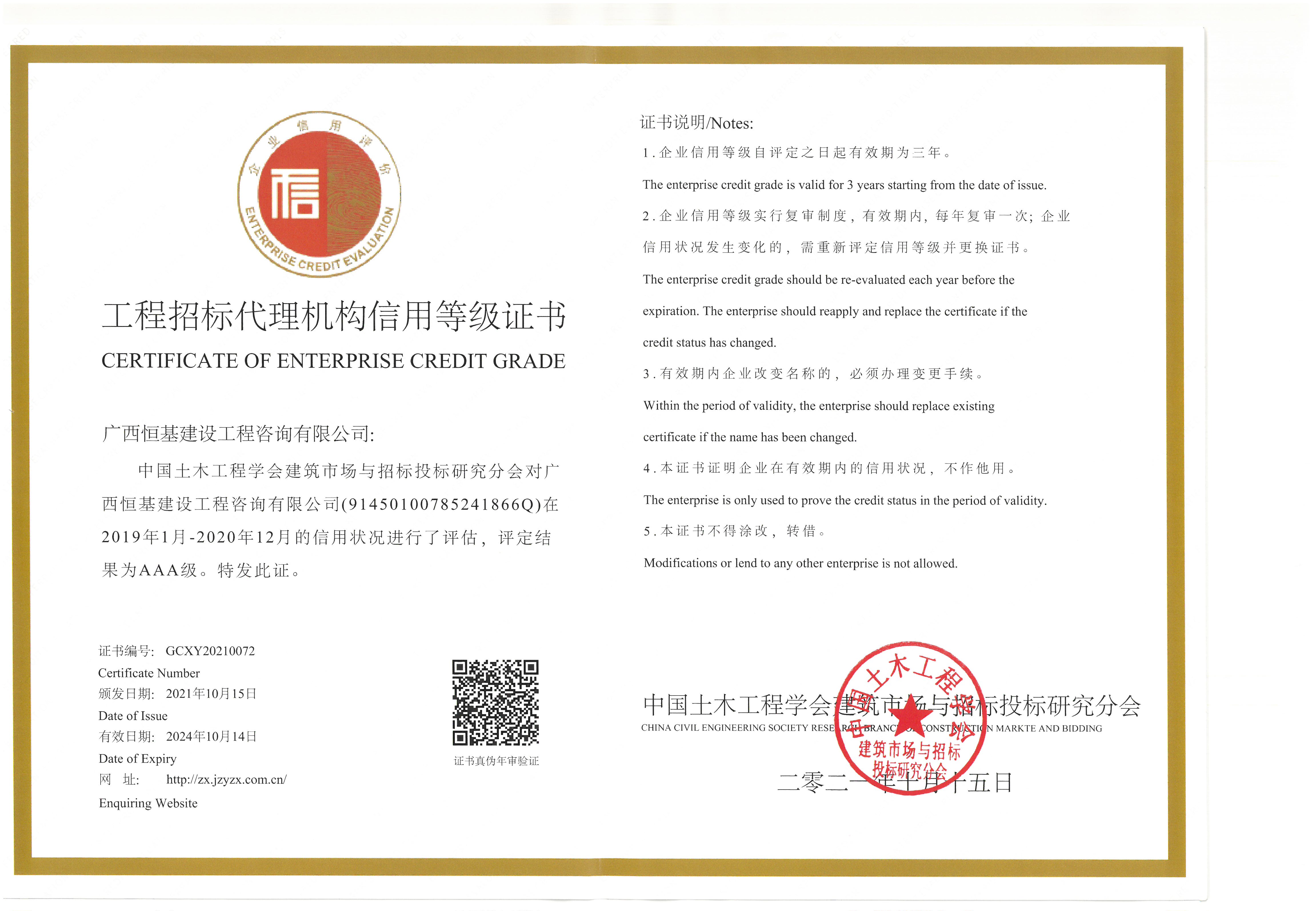 工程招標(biāo)代理機(jī)構(gòu)信用等級證書AAA級