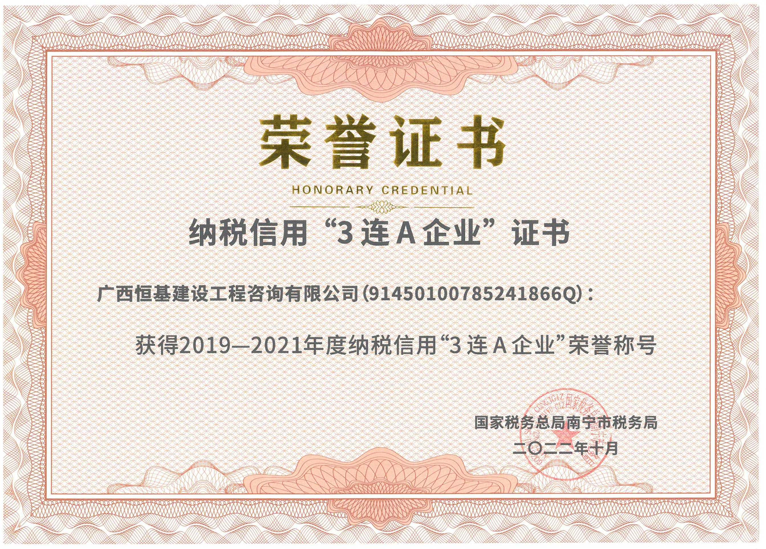 2019-2021年度納稅信用“3連A”企業(yè)證書